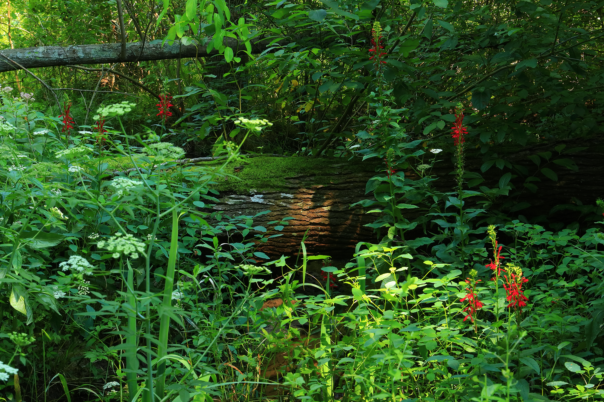 Iris, cardinal flower and water hemlock in natural setting.