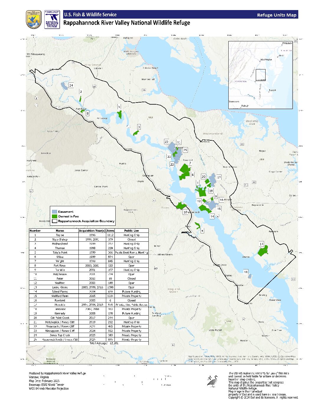 - There are currently 17 Refuge units containing over 9,500 acres located in Essex, King George, Caroline, Richmond, and Westmoreland counties.
