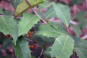 Leaves: Alternate, simple, evergreen, leathery, glossy, 2 to 4 inches long, with widely spaced spines along the edges